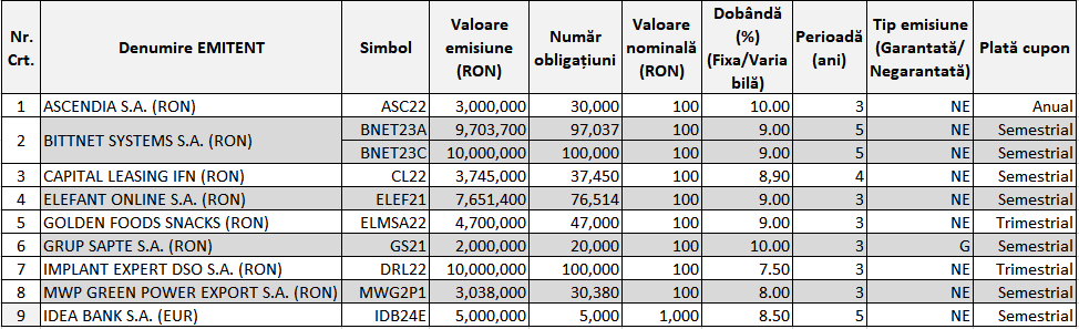 Observăm faptul că aferent acestor emisiuni, perioada medie a împrumutului obligatar este de 3 ani cu o dobânda medie de 9%, majoritatea sunt negarantate, valoarea minimă a emisiunii fiind de 2.000.000 ron, iar valoarea maximă fiind de 10.000.000 ron (pentru emisiunile în ron).