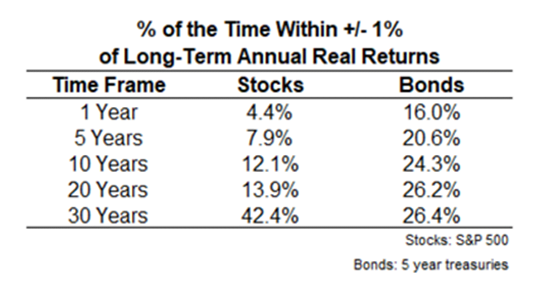 În mod surprinzător, în cazul acțiunilor, abia când ajungem la ferestre de timp de 30 de ani doar jumătate din intervalele anualizate (42,4%) se situează în plaja stabilită legată de media pe termen lung. Este de așteptat că pe orizonturi scurte de timp (1, 5, 10 ani) randamentele obținute de acțiuni să varieze semnificativ. Dar chiar și atunci când extindem intervalul actualizat la câteva decade, nu obținem neapărat o probabilitate mai mare de atingere a randamentelor medii.