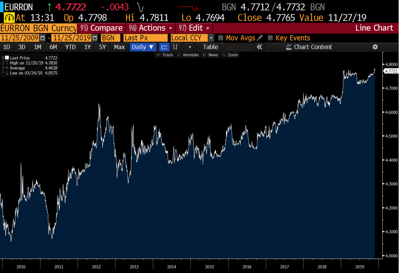 Chiar dacă leul este administrat oficial de către BNR într-un regim controlat ce presupune mai puțină volatilitate decât alte monede din regiune, acesta a înregistrat o depreciere continuă în ultimii 10 ani față de EUR din cauza deficitelor structural comerciale și de cont curent, dar și a diferențelor de inflație înregistrate de către economia României față de economiile din zona euro. După cum se poate vedea în graficul de mai jos, în perioada 2009-2018, RON a înregistrat o depreciere anuală agregată față de EUR de 1.59%.